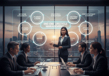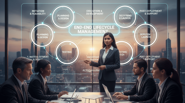 From the initial feasibility study to post-deployment support, ACP-Consulting manages the entire Project Management Life Cycle (PMLC). We take the burden of daily coordination off your shoulders, overseeing resource allocation, vendor management, and technical documentation. Our rigorous "Definition of Done" ensures that no project is considered finished until it is fully tested, documented, and transitioned to your operations team. We don’t just launch projects; we ensure they are sustainable and scalable for the future.